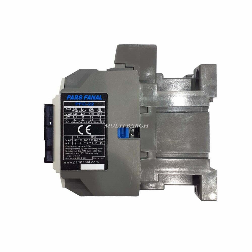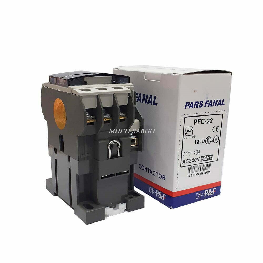 کنتاکتور 22 آمپر سه فاز پارس فانال مدل PFC-22 با ولتاژ کاری 220 ولت AC می باشد.کنتاکتور پارس فانال دارای سه پل با جریان نامی 22A موتوری و 40A روشنایی توان نامی 11 کیلو وات معادل 15 اسب بخار است.کنتاکتور سه پل (سه فاز) یک کلید الکترو مغناطیسی می باشد که برای کنترل جریان بیش از حد بکار گرفته می شود.سری کنتاکتورهای شرکت P&F در دو ولتاژ 110VAC و 220VAC تولید می شود.